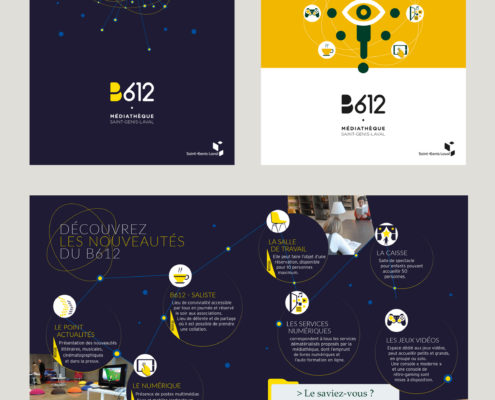B612 • La nouvelle Médiathèque de Saint-Genis-Laval Projets de plaquette de présentation du B612. Nouveau nom, rénovation intérieure et extérieure et relooking total après 18 mois de travaux.
